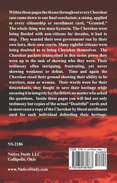 Within these pages the theme throughout every Cherokee case came down to one final conclusion; a stamp, applied to every citizenship or enrollment card, "Granted." The whole thing was mass hysteria. The Cherokee were being flooded with non-citizens for decades, it had to stop. They wanted their own government run by their own laws, their own courts. Many rightful citizens were being doubted as to being Cherokee themselves. The Cherokee packets transcribed in this series prove they were up to the task of showing who they were. Their testimony often intriguing, frustrating, yet never showing weakness or defeat. Time and again the Cherokee stood their ground showing their ability to be warriors, man or woman. Their words were for their descendants, they fought to save their heritage while encasing it in integrity for the future, no matter who asked the questions. Inside these pages you will find not only testimony but copies of the actual "Doubtful" cards and in most cases a copy of the Cherokee by blood enrollment card for each individual defending their heritage.