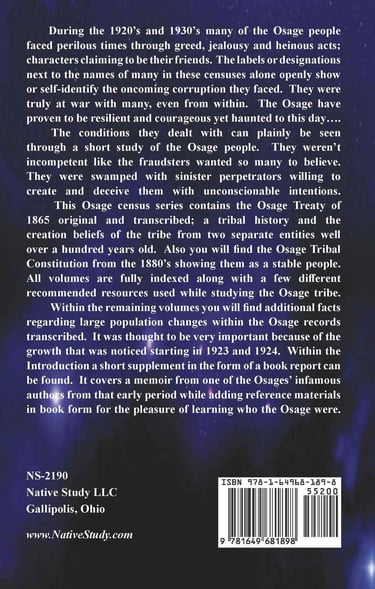 This Osage census series contains the Osage Treaty of 1865 original and transcribed; a tribal history and the creation beliefs of the tribe from two separate entities well over a hundred years old. Also you will find the Osage Tribal Constitution from the 1880’s showing them as a stable people. All volumes are fully indexed along with a few different recommended resources used while studying the Osage tribe.